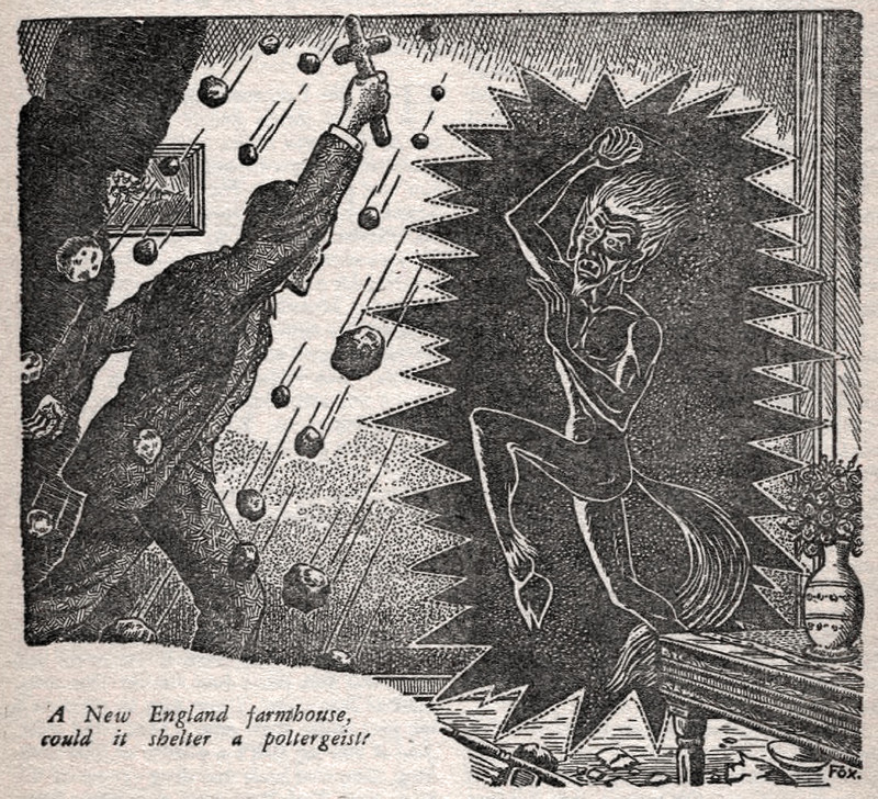 "A New England farmouse, could it shelter a poltergeist." From Weird Tales volume 42 number 4 (May 1950).