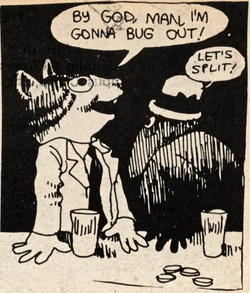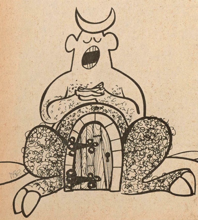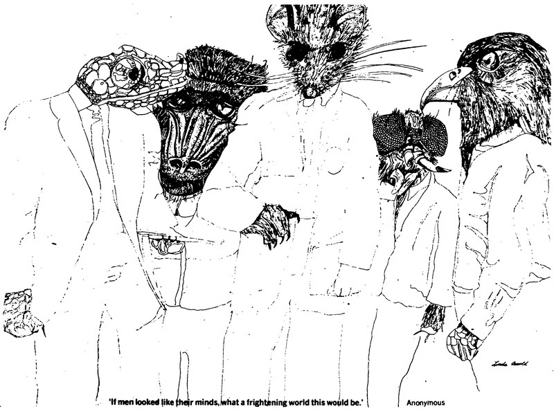 Ironically, this depicts the unevolved mind of the artist more than it does humanity at large. The caption reads, "If men looked like their minds, what a frightening world this would be." From The Martlet, 1972.