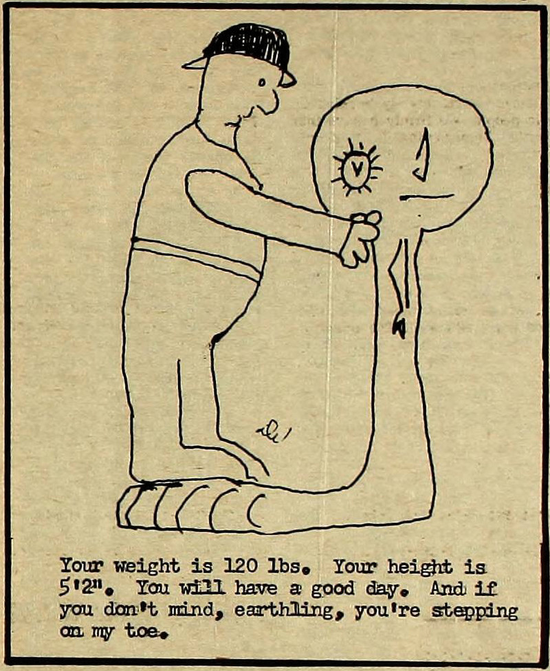 "Your weight is 120 lbs. Your height is 5'2". You will have a good day. And if you don't mind, earthling, you're stepping on my toe." From the [Thornton] Courier, 1973.