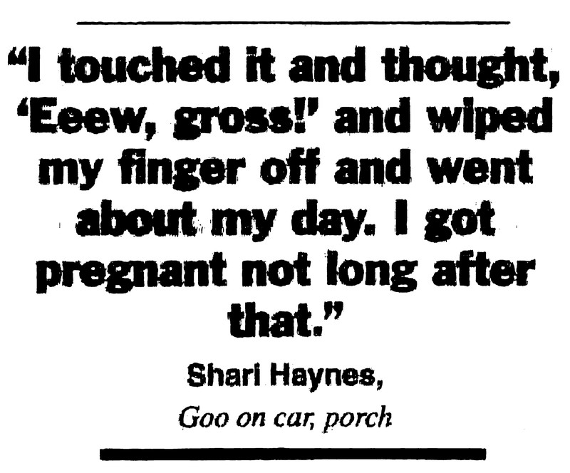 "I touched it and thought, 'Eeew, gross!' and wiped my finger off and went about my day. I got pregnant not long after that." —Shari Haynes, Goo on car, porch. Via UFO Newsclipping Service, 1999.