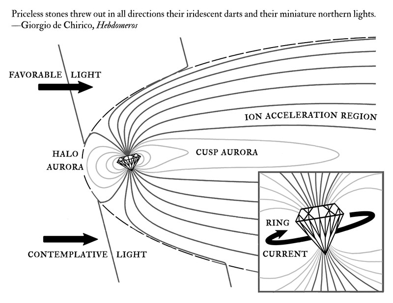 This is a guest piece we created for DJ Misc's [now defunct] blog, showing how diamonds throw out miniature northern lights, inspired as we wre by a de Chirico quotation: "Priceless stones threw out in all directions their iridescent darts and their miniature northern lights."