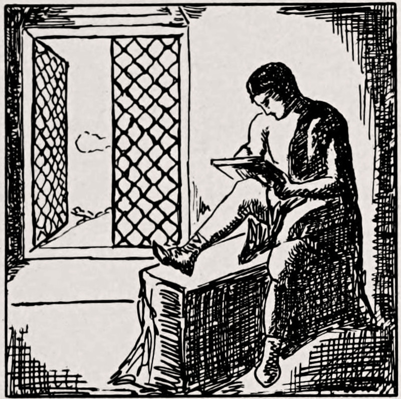 Tailoring a bean. From Grimm's Fairy Stories, Supplementary to First Reader by M. Winifred Haliburton, 1900.
