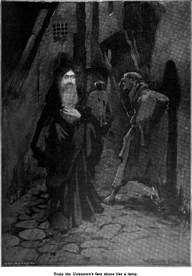 An illustration from an 1898 issue of The Idler magazine. The caption reads: "Truly the Unknown's face shone like a lamp."