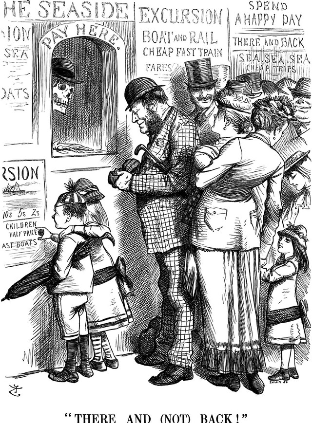 An illustration from an 1878 issue of Punch magazine. The caption reads: "There and (not) back!"