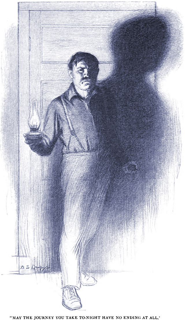 An illustration from a 1907 issue of The Reader magazine. The caption reads: "May the journey you take to-night have no ending at all."