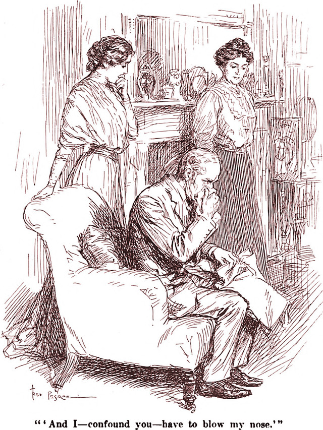 An illustration from a 1908 issue of The Windsor magazine. The caption reads: "And I—confound you—have to blow my nose."