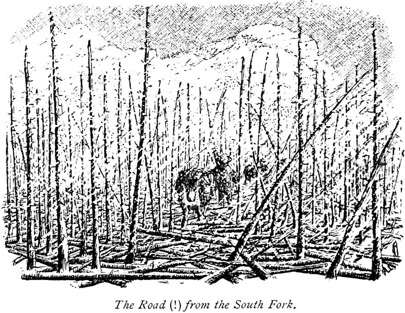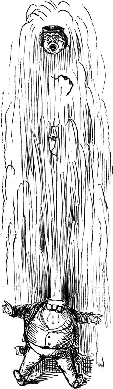 An illustration from A Tramp Abroad Etc. by Samuel Langhorne Clemens (1897). The caption reads: "Turn on more rain."