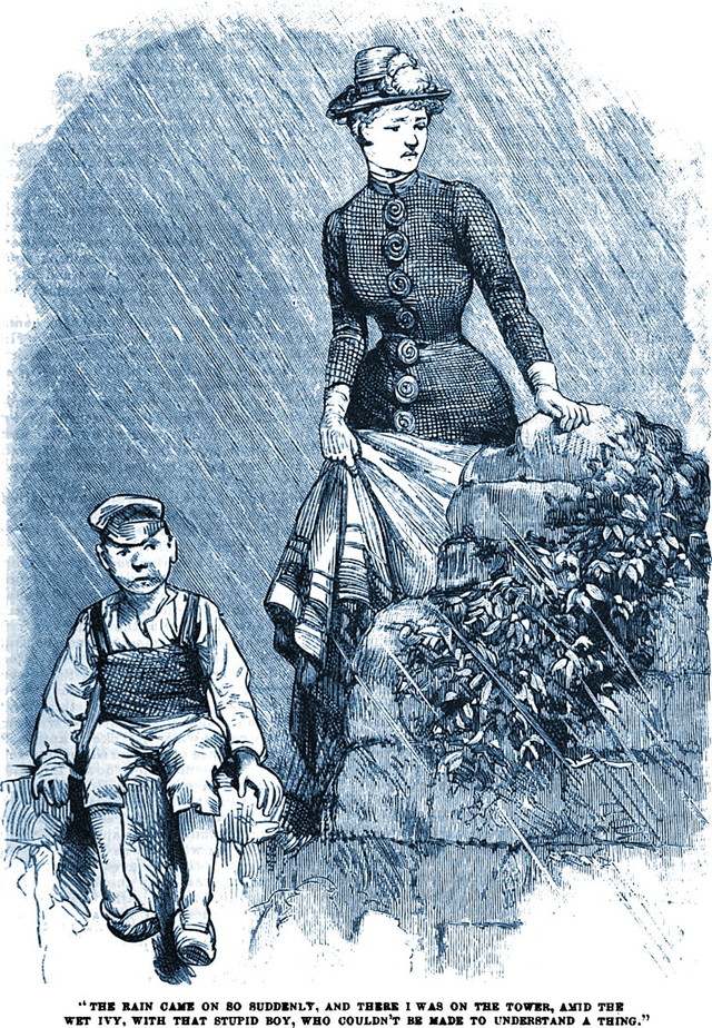 An illustration from an 1887 issue of Frank Leslie's Pleasant Hours magazine. The caption reads: "The rain came on so suddenly, and there I was on the tower, amid the wet ivy, with that stupid boy, who couldn't be made to understand a thing."