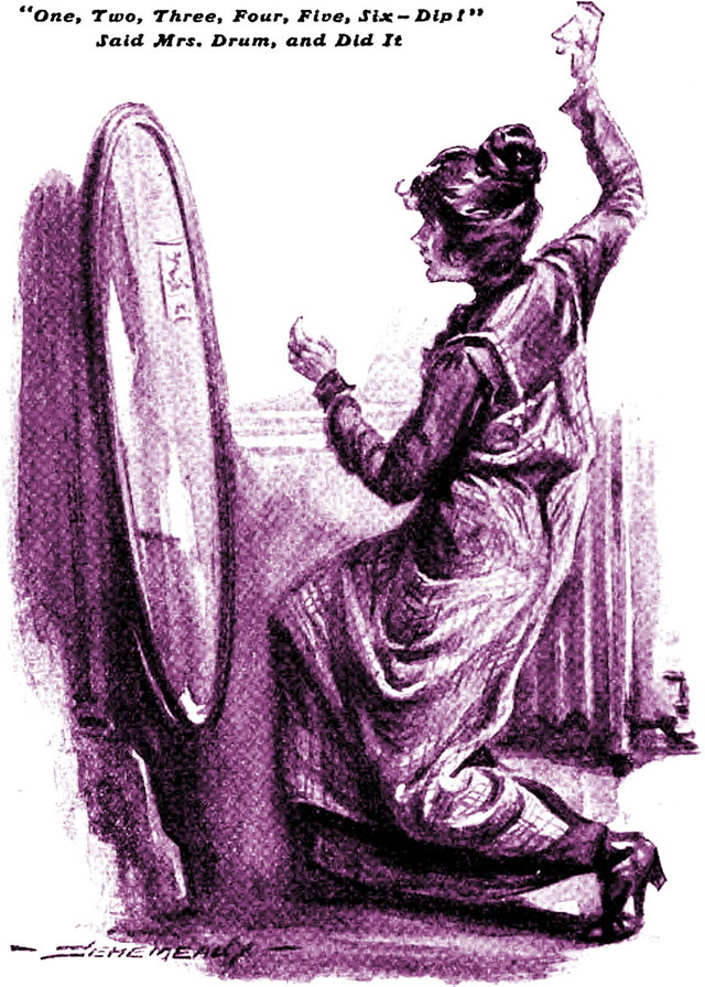The lost art of mirror dipping, from The Saturday Evening Post (1914). The caption reads: "'One, Two, Three, Four, Five, Six — Dip!' said Mrs. Drum, and did it."