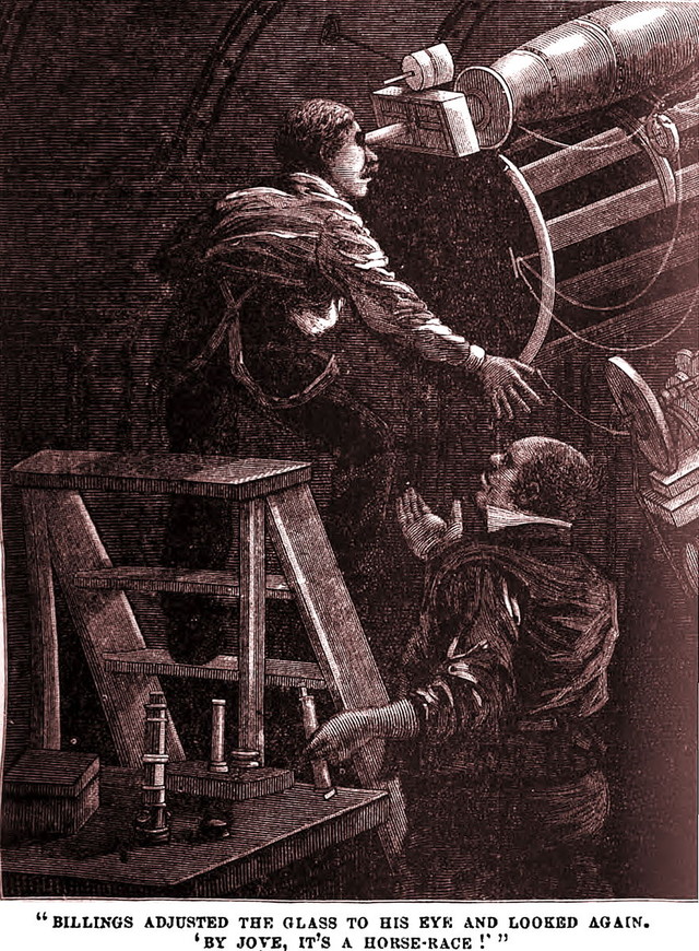 An illustration from an 1887 issue of Frank Leslie's Pleasant Hours magazine. The caption reads: "Billings adjusted the glass to his eye and looked again. 'By Jove, it's a horse-race!'"