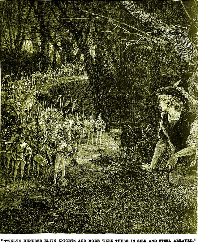 An illustration from an 1887 issue of Frank Leslie's Pleasant Hours magazine. The caption reads: "Twelve hundred Elfin knights and more were there in silk and steel arrayed."