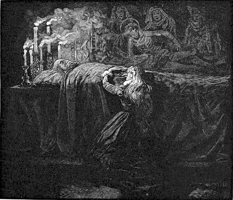 An illustration from an 1897 issue of The Quiver magazine. The caption reads: "Tormented by the family pictures."