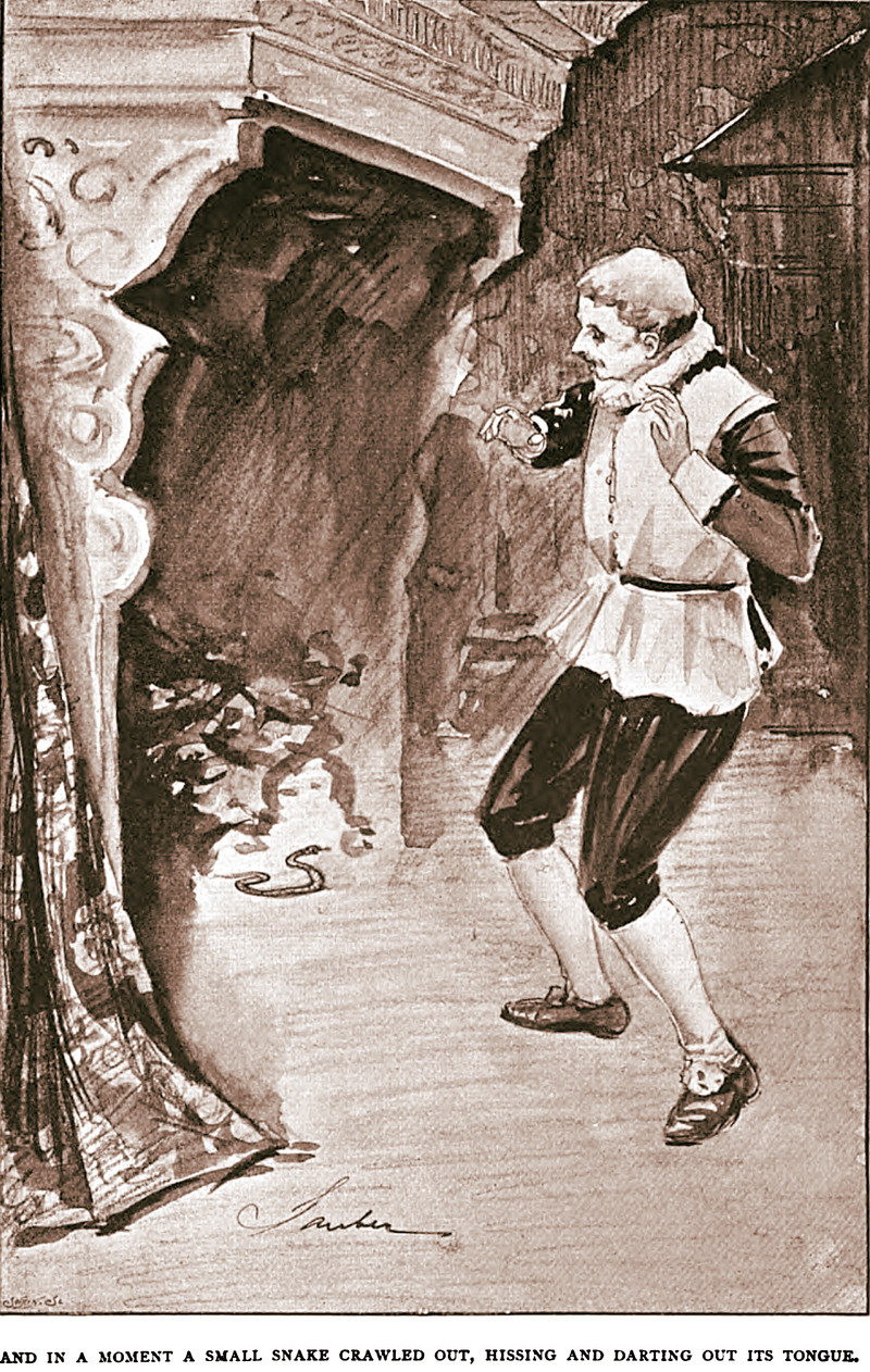 "And in a moment a small snake crawled out, hissing and darting out its tongue." From English Illustrated, 1895.