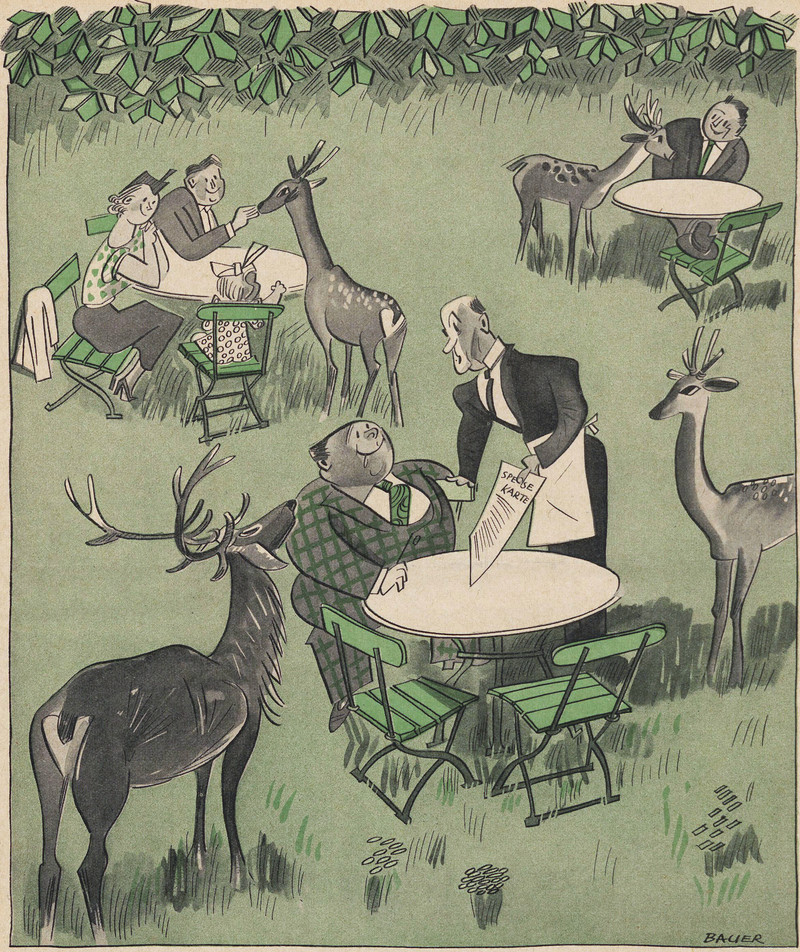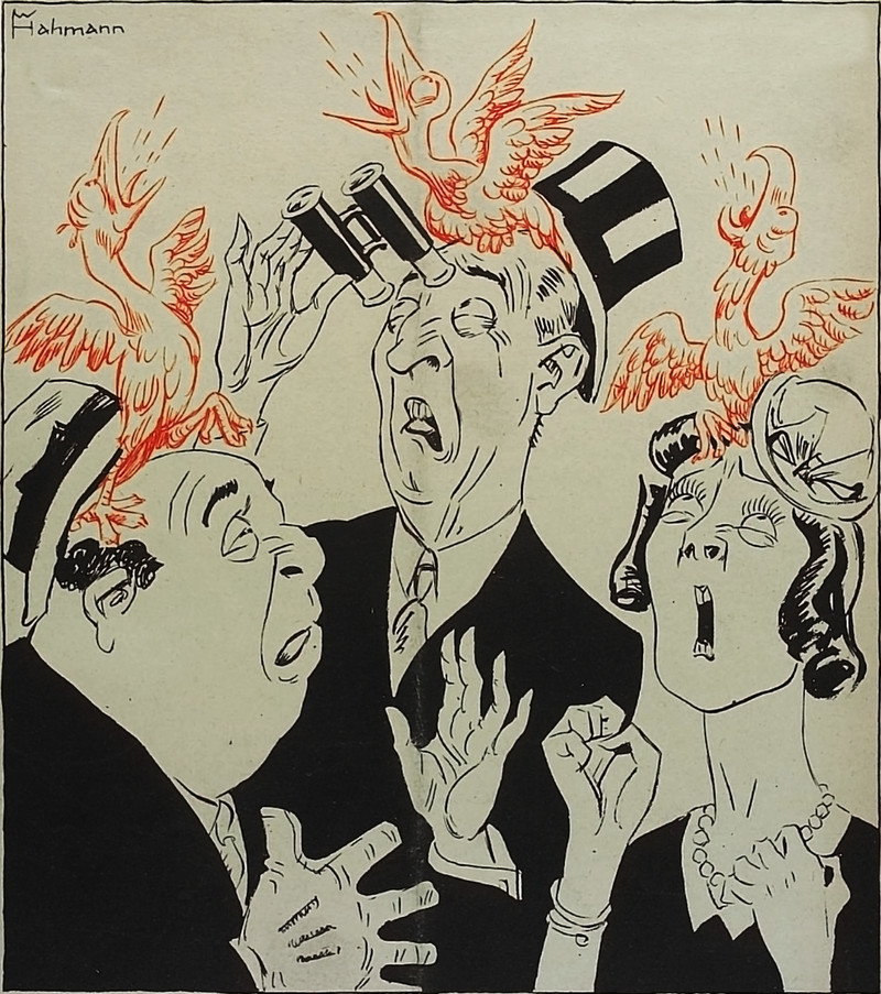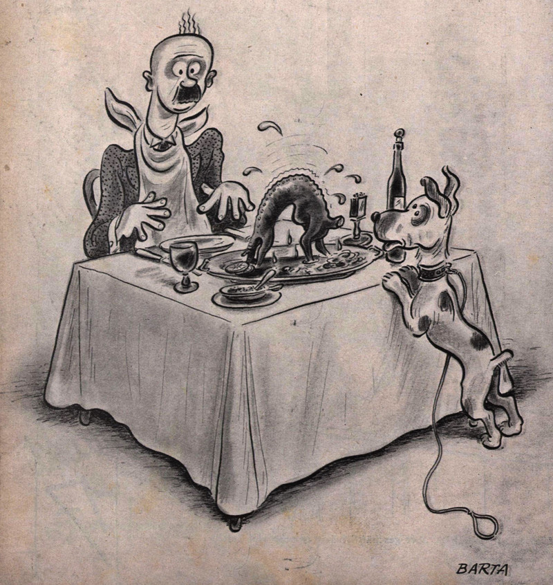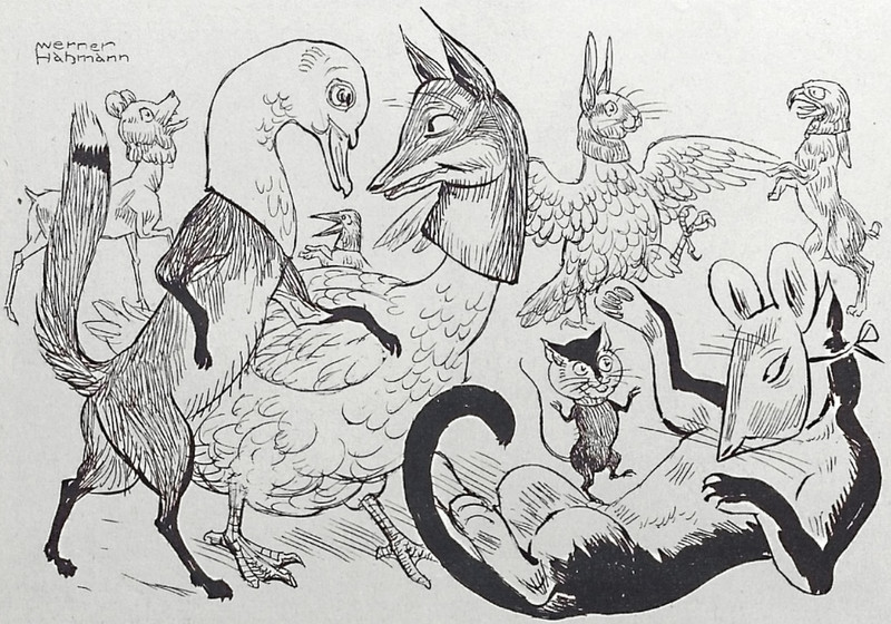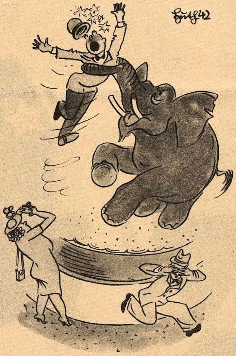 From Fliegende Blätter, 1934. These swear word animals are in German. The first one we translate as "son of a bitch," the rhino's horn referring to the sound of the German word "hurensohn." The camel can mean "idiot" in German. We presume the bull and the jackass have similar-enough meanings in German.