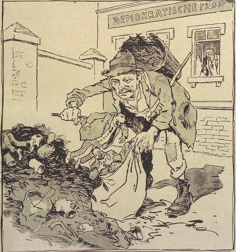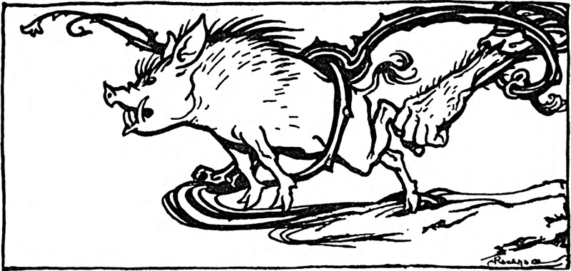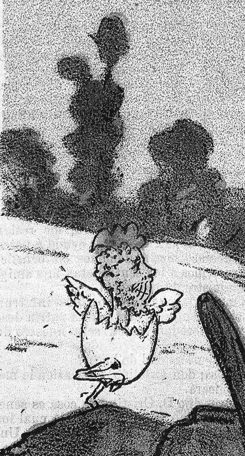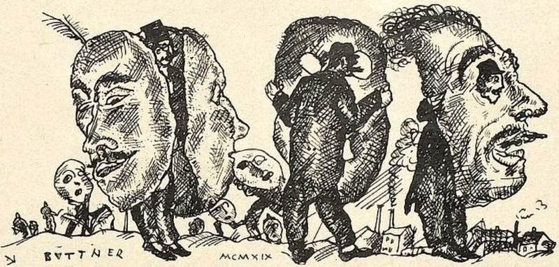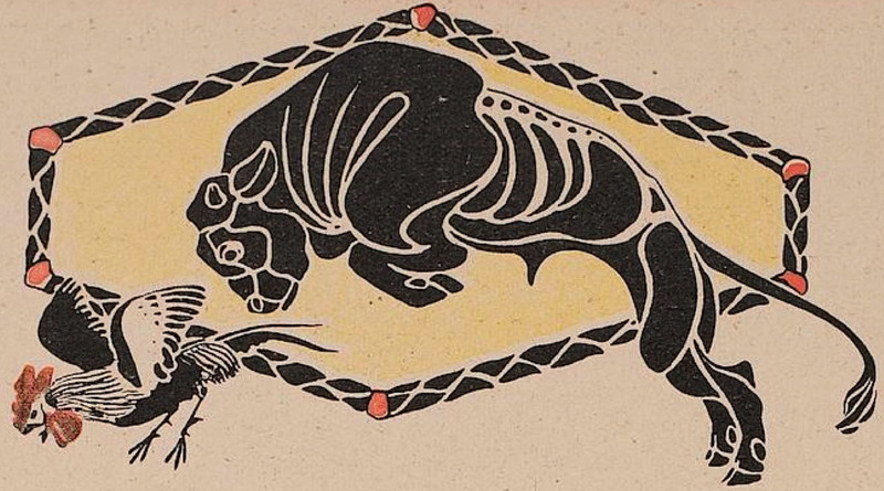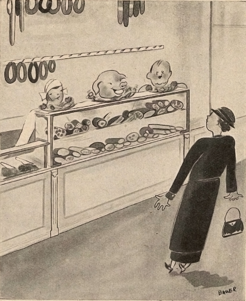 From Fliegende Blätter, 1934. These swear word animals are in German. The first one we translate as "son of a bitch," the rhino's horn referring to the sound of the German word "hurensohn." The camel can mean "idiot" in German. We presume the bull and the jackass have similar-enough meanings in German.