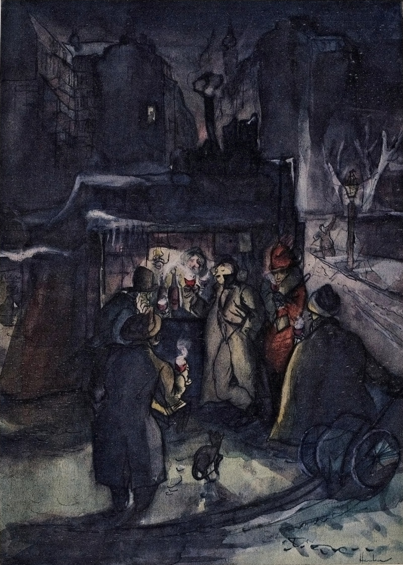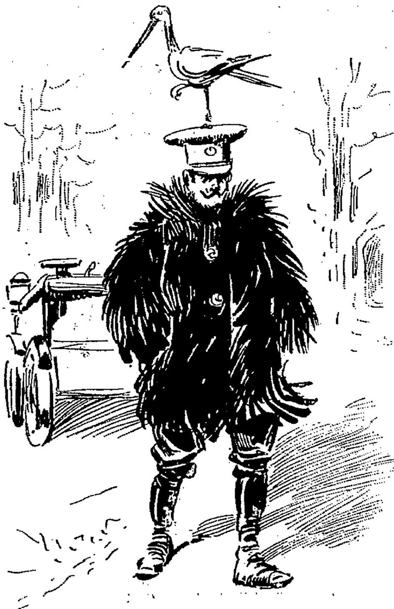 The phrase "yelling at a snowman" delivers just six Google results. In this instance, the guy is inebriated, has taken a fall, and now thinks the snowman has stolen his hat. From Le Pêle-Mêle, 1896.