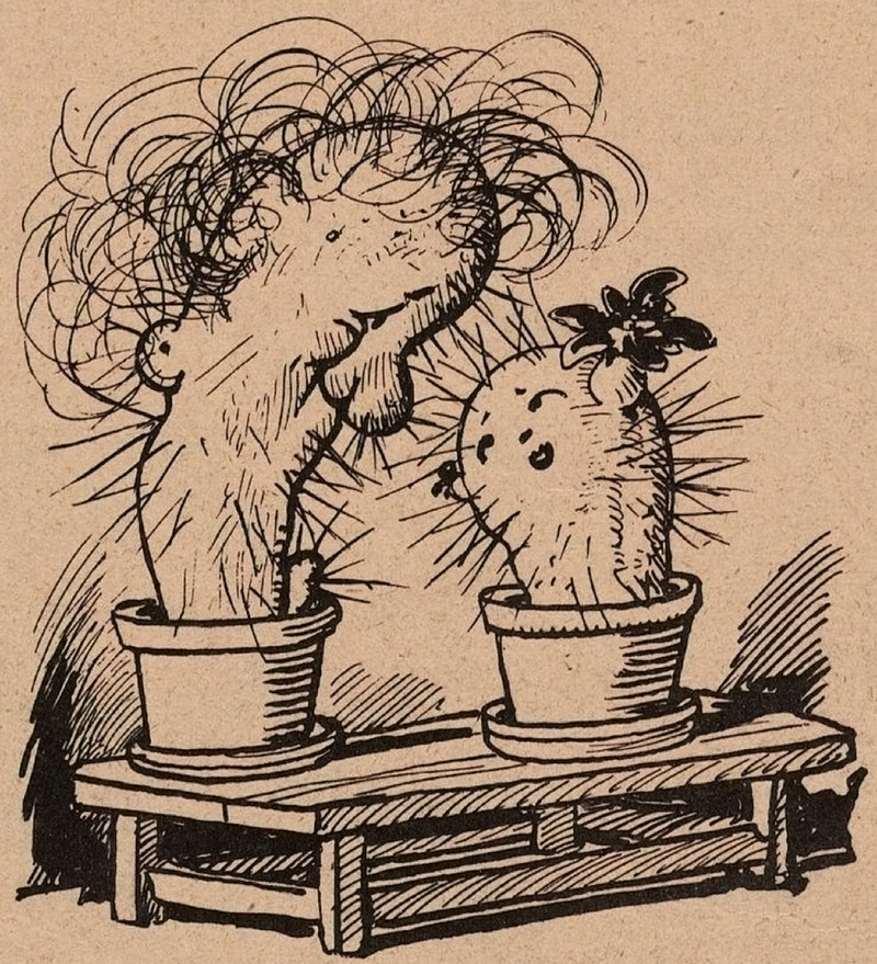 From Fliegende Blätter, 1927. See This Book is a Cactus, about which Adam McFarland writes: "For anyone who remembers what it was like to have fun without technology, this book is for you. Wait... This cactus is for you... I have managed, so far, to keep my Cactus alive. It is a bit trickier than it sounds. But it is the most fun I've had in a long time that didn't require charged batteries."