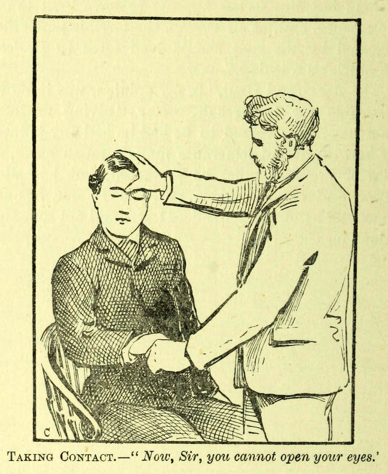 "Now, sir, you cannot open your eyes." From How to Mesmerise: A Manual of Instruction in the History, Mysteries, Modes of Procedure, and Arts of Mesmerism, or, Animal Magnetism, Hypnotism, Clairvoyance, Thought Reading, and Mesmeric Entertainment by Hames Coates, 1890.