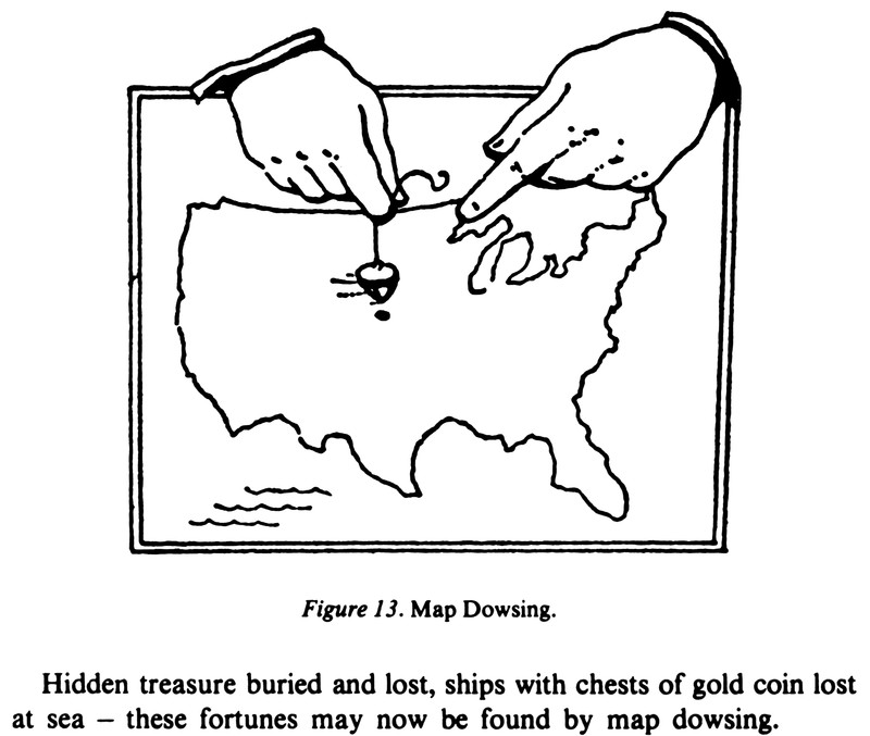 Map dowsing to find buried treasure and ships with chests of gold coins lost at sea. From Pendulum Power by Greg Nielsen, 1987