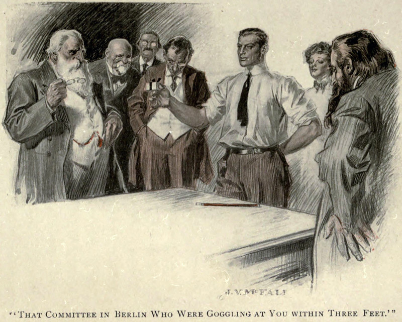 A little row of dots to fortify the endangered hero. From Someone and Somebody by Porter Emerson Browne, 1917.