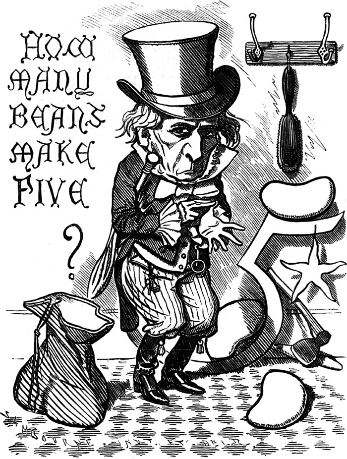 [We answered this rhetorical question a few years ago, but the vintage illustration is "new," courtesy of Punch, 1877.] Q: How many beans make five? A: It’s something of a trick question. The answer is "one." One leguminous pod contains five seeds. Note that this riddle is a corruption of "How many beans make fava." Again, the answer is "one," though admittedly it's one very broad bean.