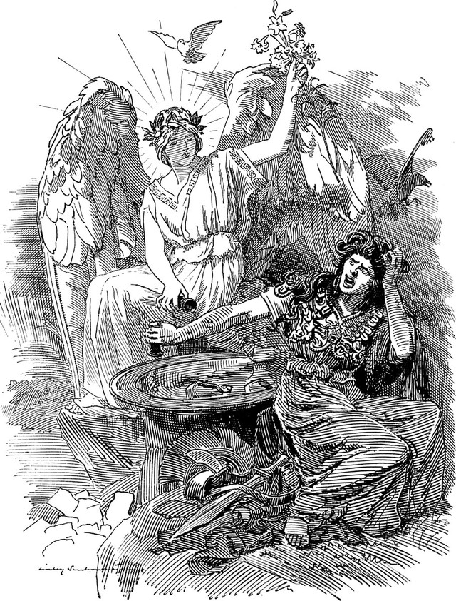 The spirit of peace plays a game of dice with the spirit of strife. An illustration from a 1902 issue of Punch magazine.