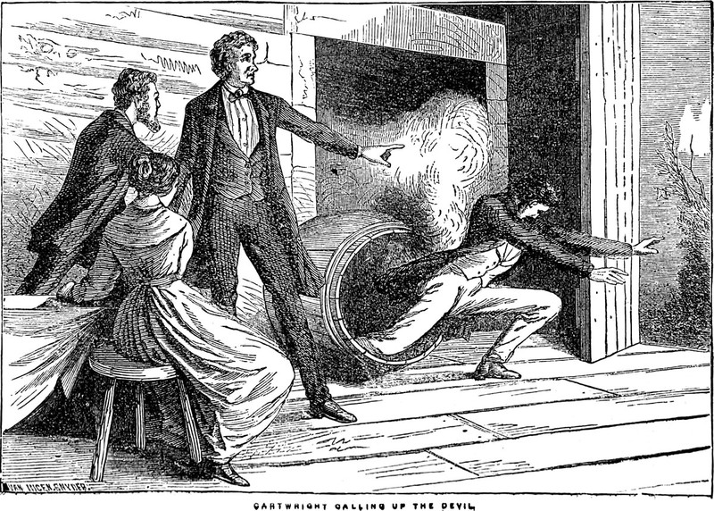An illustration from an 1870 issue of Beecher's magazine. The caption reads: "Cartwright calling up the Devil."