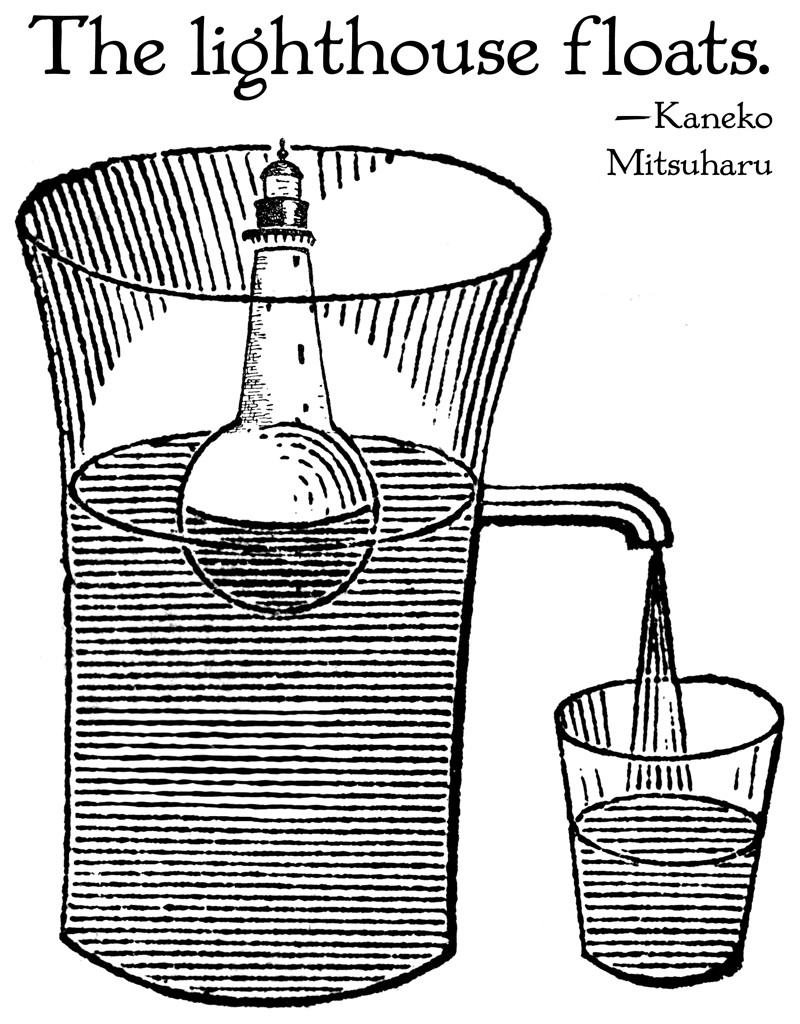 The text reads: "The lighthouse floats. —Kaneko Mitsuharu"