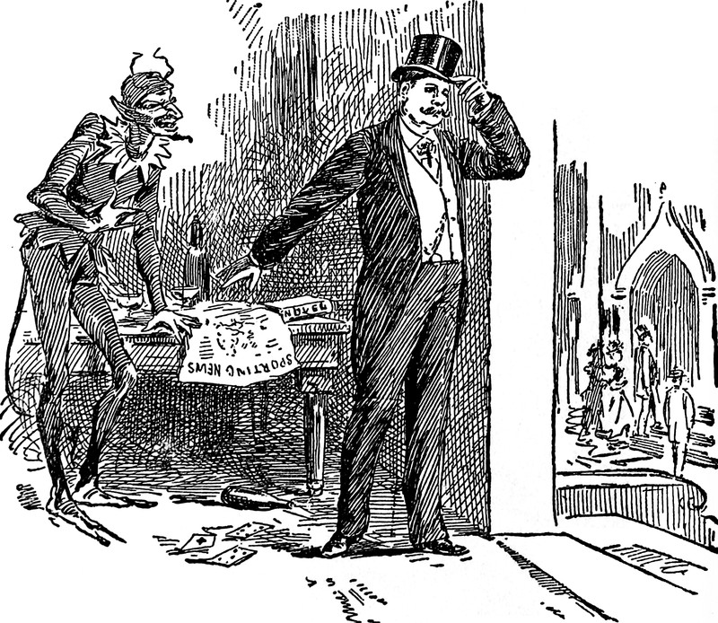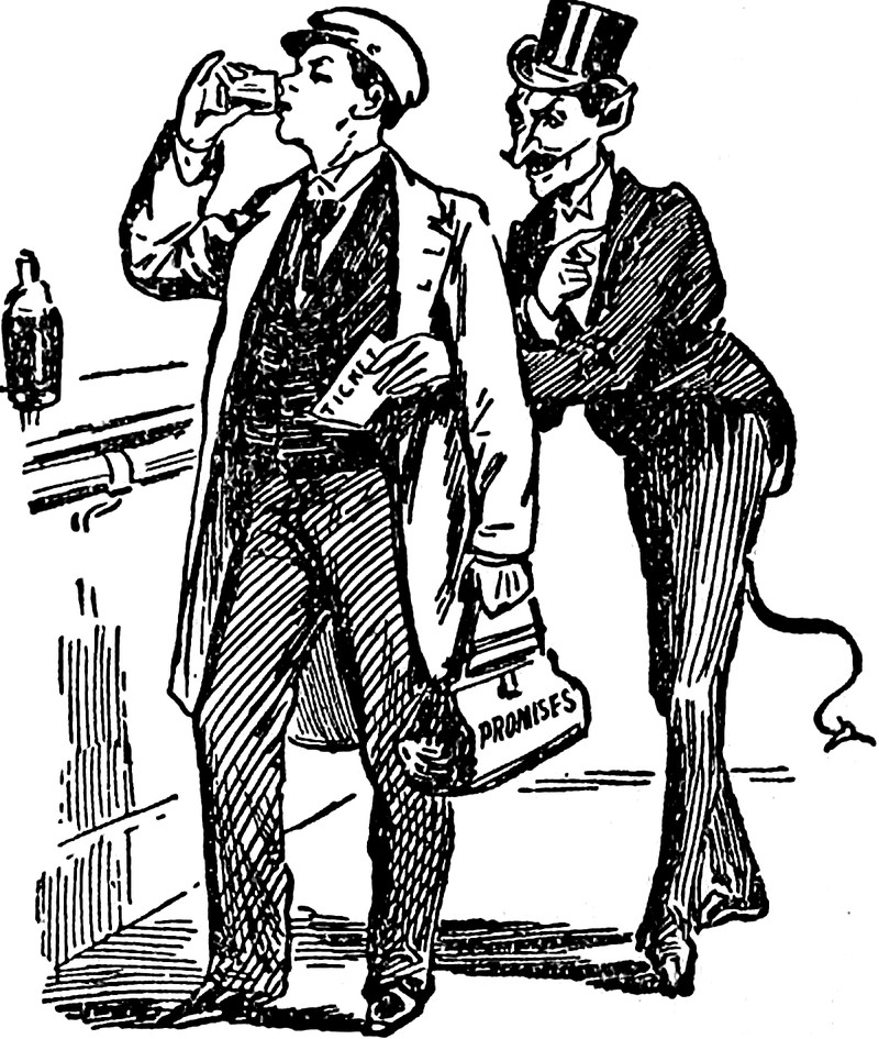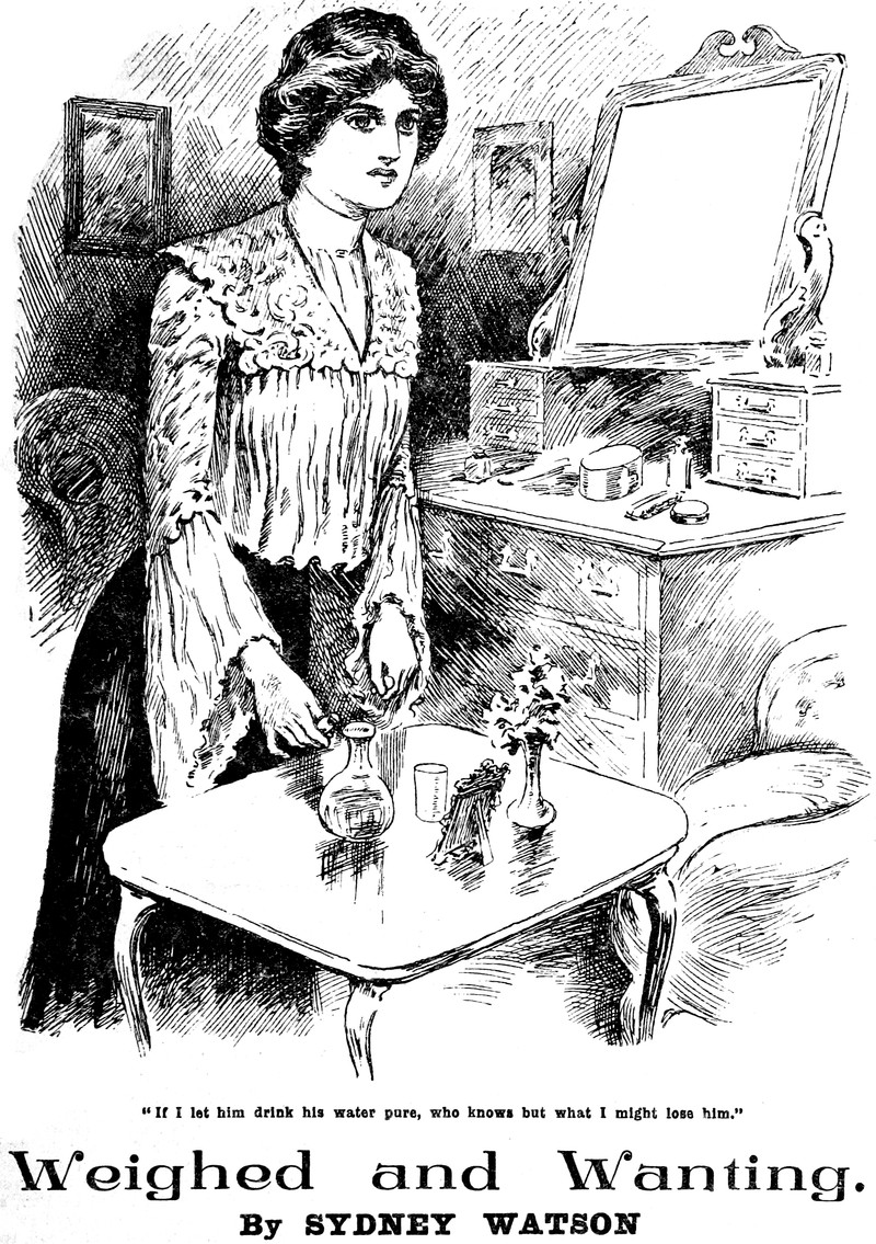 "If I let him drink his water pure, who knows but what I might lose him." From "Weighed and Wanting" by Syndey Watson, from Thrilling Life Stories for the Masses, 1892.