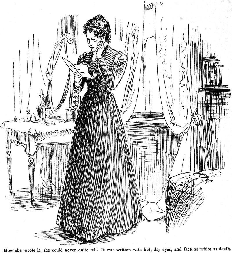 "How she wrote it, she could never quite tell. It was written with hot, dry eyes, and face as white as death." From Thrilling Life Stories for the Masses, 1892