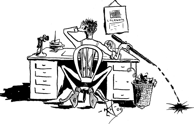 You've seen the cliché of a frustrated writer tossing away page after crumpled page, but here's one tossing the ink, too. From Colorado College Nugget yearbook, 1909. See How to Hoodoo Hack a Yearbook.