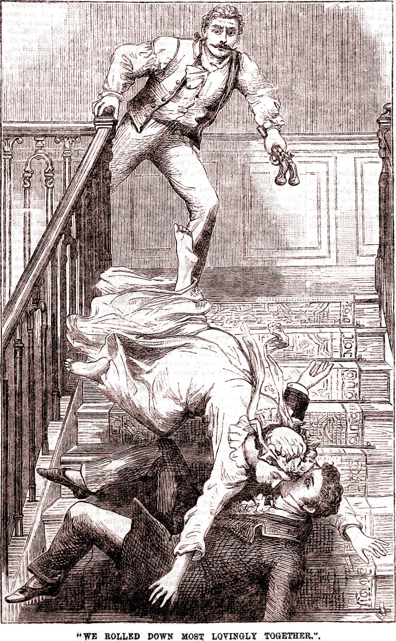 If you must tumble down the stairs, for goodness' sake do it lovingly. The caption reads, "We rolled down most lovingly together." From Dicks' English Library of Standard Works, 1884.
