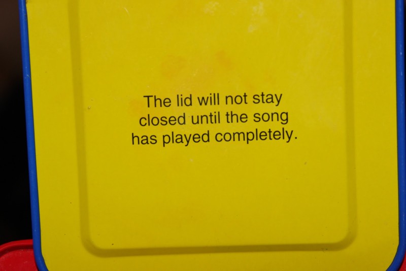 Q: What is the purpose of this spoiler/disclaimer? When I was a kid, our jack-in-the-boxes didn't warn us. No way, no how. If you were going to have a heart attack, you were just going to have a heart attack when the evil troll that lives in that box came for you at an astonishing rate of speed. Plain and simple. But now there are warnings on the damn thing. The funniest part is I don't think too many two-year-olds read. So the point is...? —William Keckler