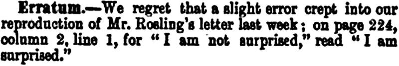 "For 'I am not surprised,' read 'I am surprised." A correction from The Electrical Review, 1900.