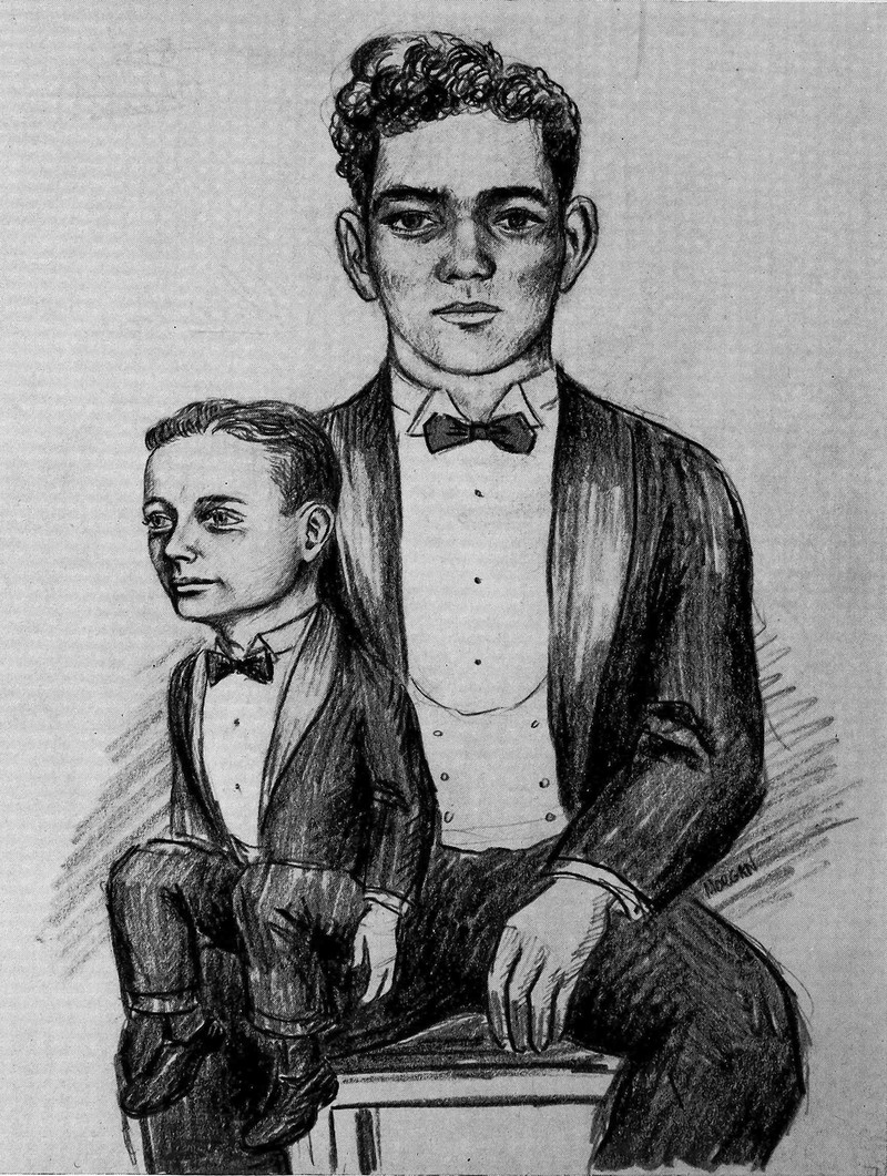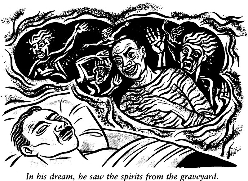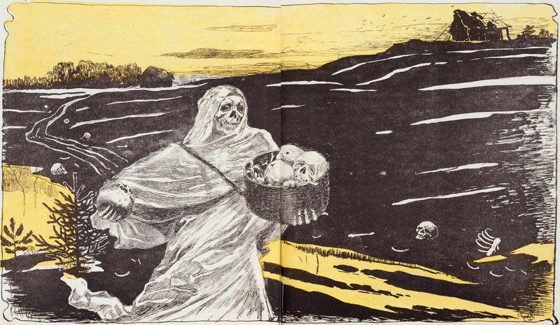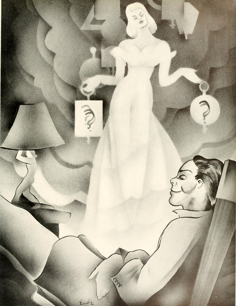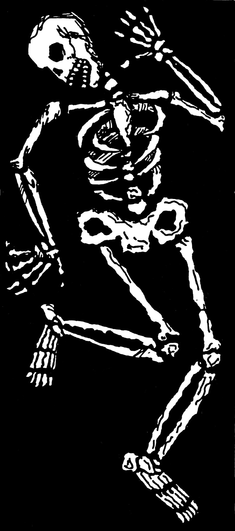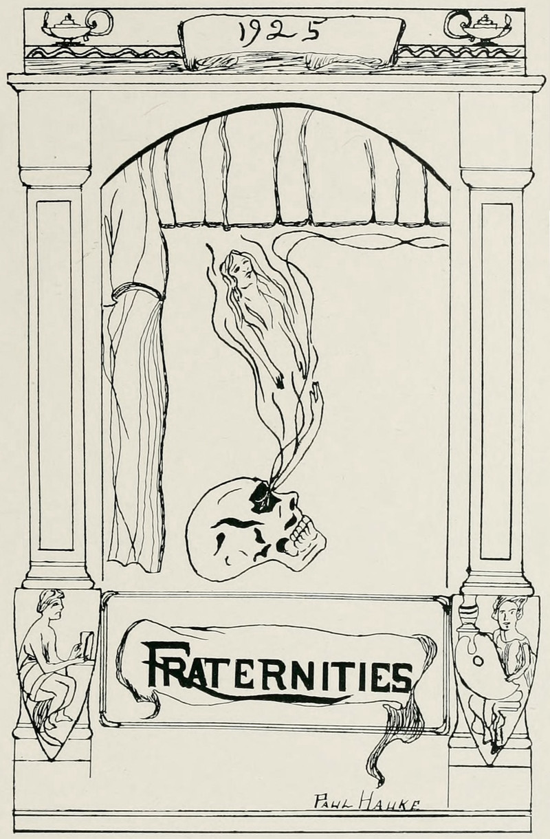 Rising from the eye socket of the skull, a spirit, but also a reaching hand to pull it back down. From Susquehanna's 1926 yearbook.