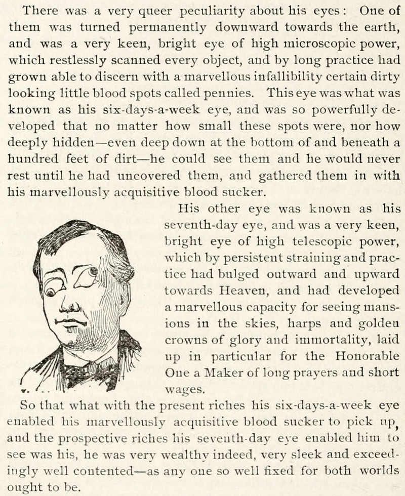 A "six-days-a-week" eye looks toward pennies on the ground, and a "seventh-day" eye looks toward Heaven. From The Dogs and the Fleas by Frederic Scrimshaw, 1893.