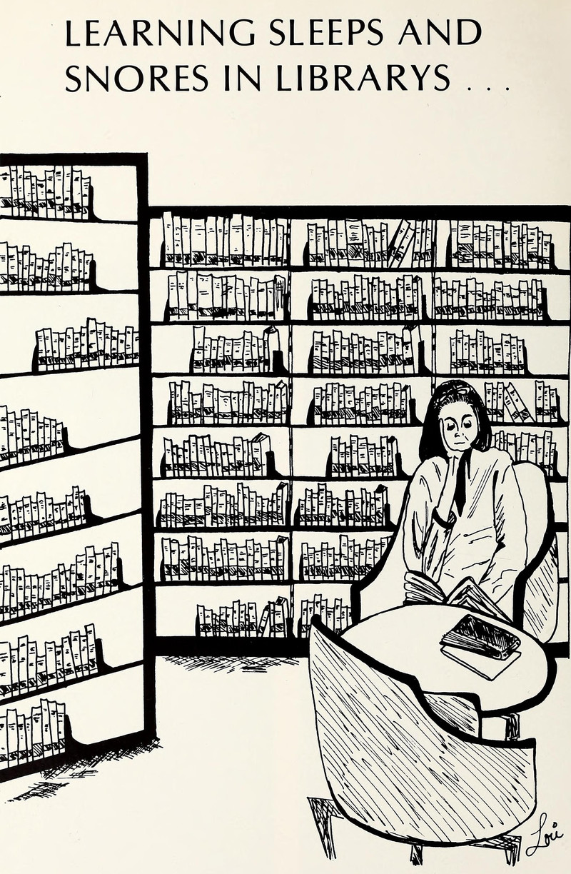 Learning perhaps ought to quit sleeping and snoring so as to grasp how to properly pluralize "library." From National-Louis' 1969 yearbook.
