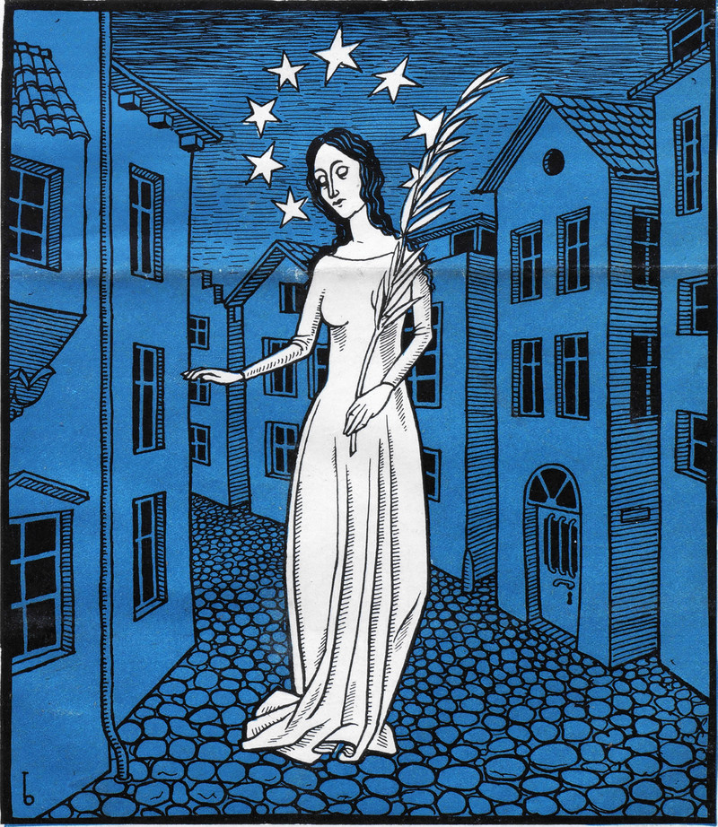 Peace's halo is made of stars. From Nebelspalter, 1926.