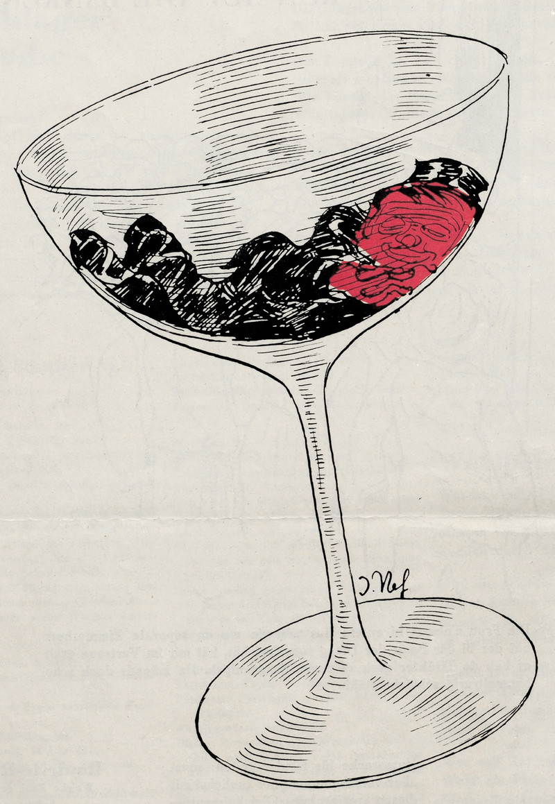 He's seeing bendy bottles with that idiomatic monkey on his back. From Der Bärenspiegel, 1930.