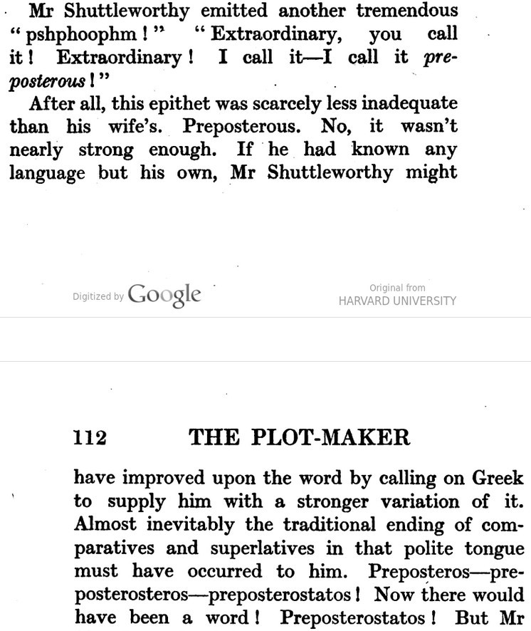 [I note that this is the second time Hewlett characters have interjected a *singular* "fiddlestick" for us--so now we have a pair, though I guess a violinist really needs only one at a time. Likewise, the "permutations and combinations" business had its double in the last WH book I read.)]***A beastly-looking man with a face like a tooth.***It was difficult to be impressive in a blanket, but Arthur managed it.***uttering shrill, staccato oaths***He was in great disorder; his wig had fallen off, and his carefully contrived false stomach had worked 'round to his back. [Alas, this book has no illustrations.]***Meaker drifted about like a damaged but still inflated balloon.***[Bonus: A presumably fictitious author writing sensational novels under the name "Zox."]