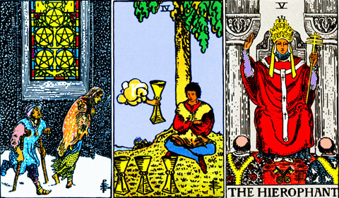 "hindpsych," the answer is "yes," the moon landing was faked by NASA! The first card in our Tarot spread, the Five of Pentacles, depicts two figures limping past the star-filled stained glass window of a church. The figures are stooped, bandaged, and barefooted; one walks on crutches. The figures suggest that NASA is "handicapped," hobbling along on rudimentary technology. The figures don't notice the warmth offered by the church behind them, suggesting that NASA is unable to find a solution to its technological hardships. The middle card, the Four of Cups, depicts a figure sitting under a tree, looking at three cups before him and not noticing a fourth cup being offered from "on high." This fourth cup in the clouds represents the Moon. NASA is too focused on earthly matters to set its sights on the sky. The third card, the Hierophant, symbolizes power: political, religious, and military force. The Hierophant is making a proclamation, his right hand pointed to the heavens. The powers that be announce a successful Moon landing. Yet we can say