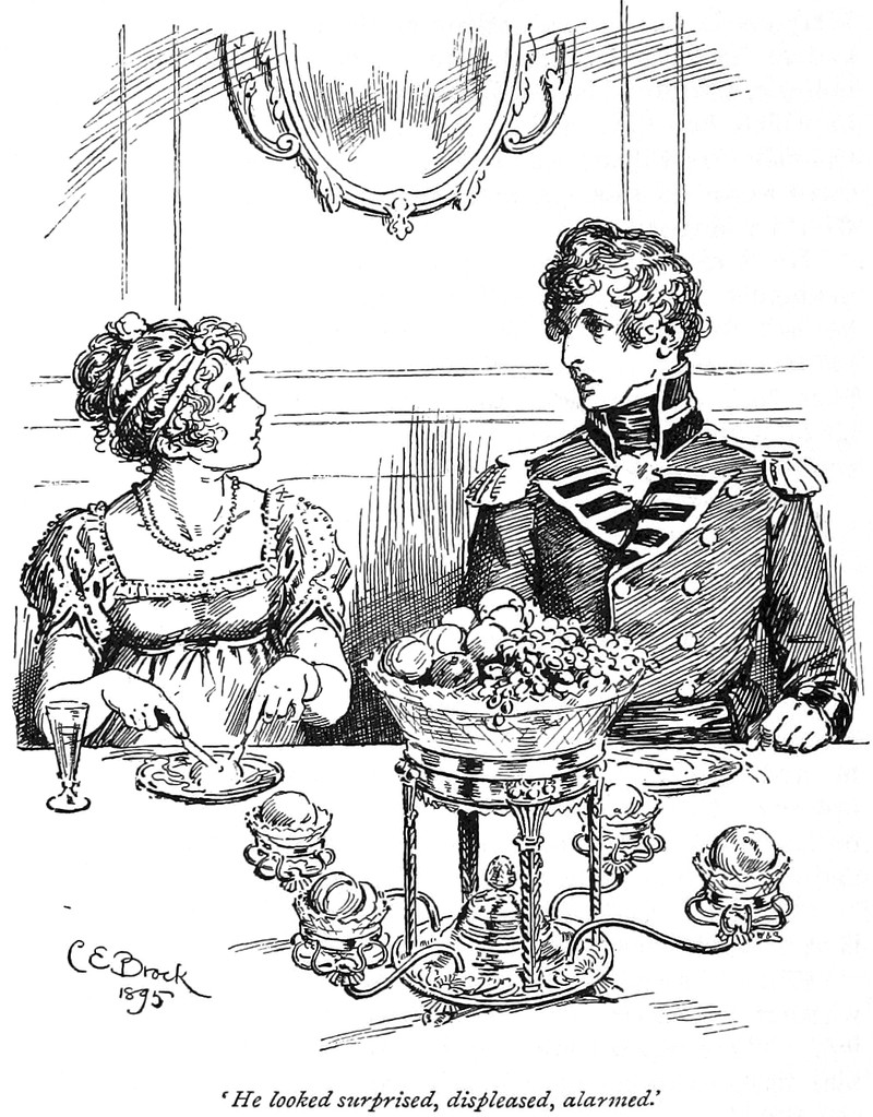 An illustration from Pride and Prejudice by Jane Austin. The caption reads: "Mrs. Bennet was privileged to whisper it to Mrs. Philips."