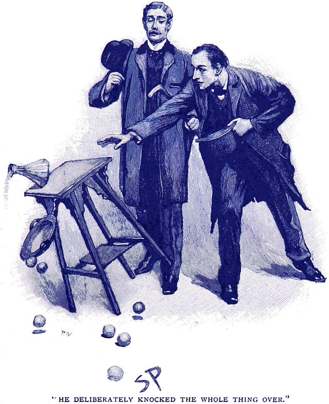 An illustration from The Memoirs of Sherlock Holmes (1894). The caption reads: "He deliberately knocked the whole thing over."