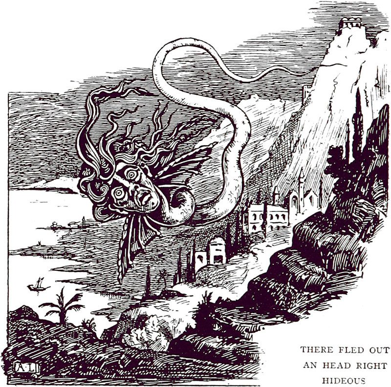 An illustration from The Marvellous Adventures of Sir John Maundevile (1895). The caption reads: "There fled out an head right hideous."