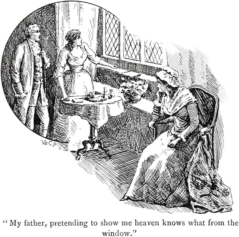 An illustration from The Evil Guest by Joseph Sheridan Le Fanu (1894). The caption reads: "My father, pretending to show me heaven knows what from the window."