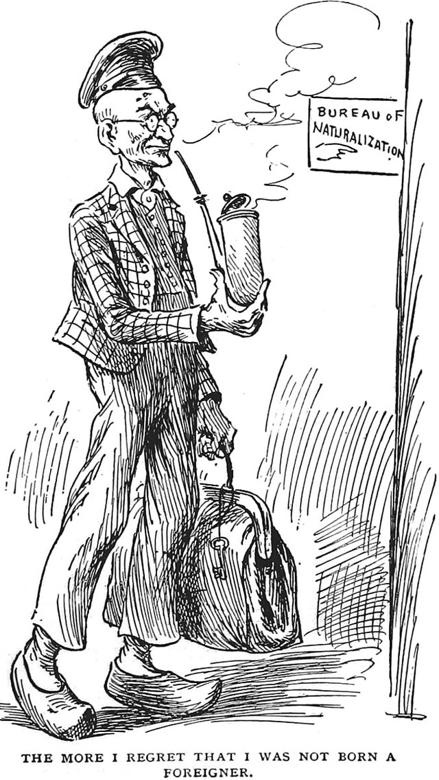 An illustration from Bill Nye's History of the United States (1894). The caption reads: "The more I regret that I was not born a foreigner."