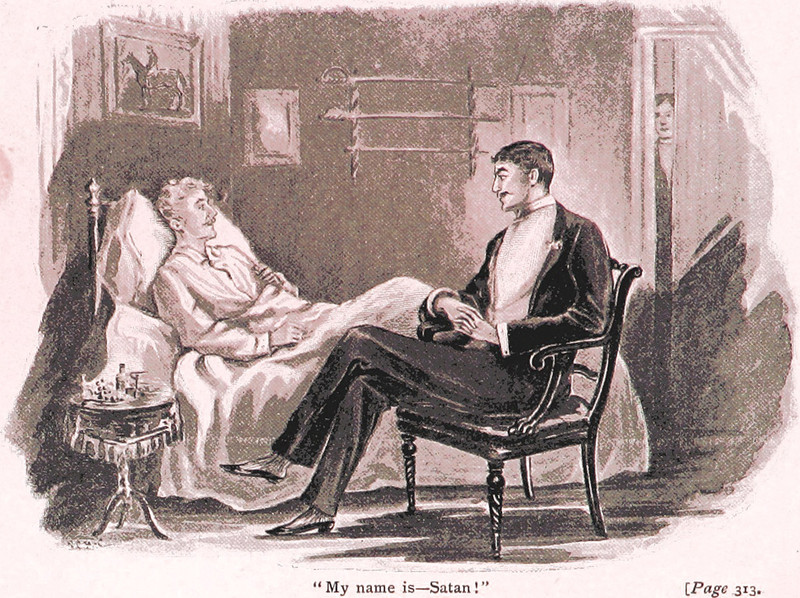 An illustration from Ghostly Tales by Wilhelmina Fitzclarence (1896). The caption reads: "My name is—Satan!"