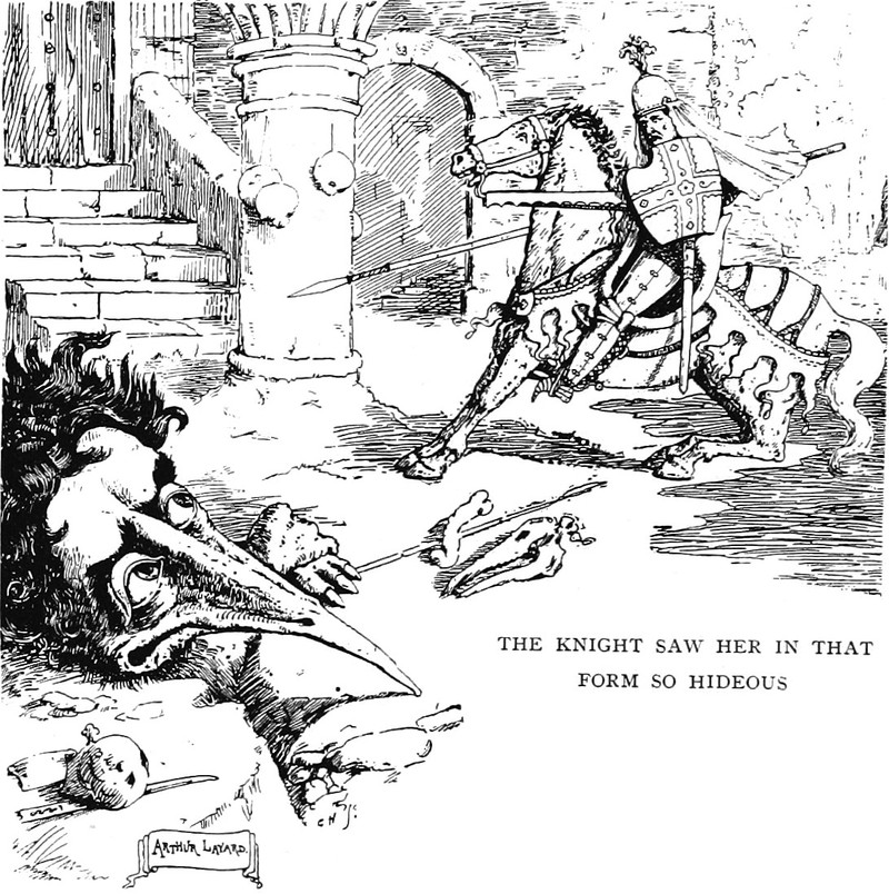 An illustration from The Marvellous Adventures of Sir John Maundevile by Sir John Mandeville (1895). The caption reads: "The knight saw her in that form so hideous."