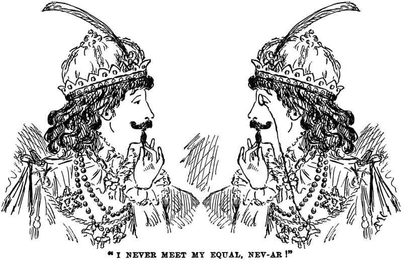 An illustration from Home Theatricals Made Easy, or, Busy, Happy, and Merry by Frances Elizabeth Callow (1891). The caption reads: "I never meet my equal, nev-ar!"
