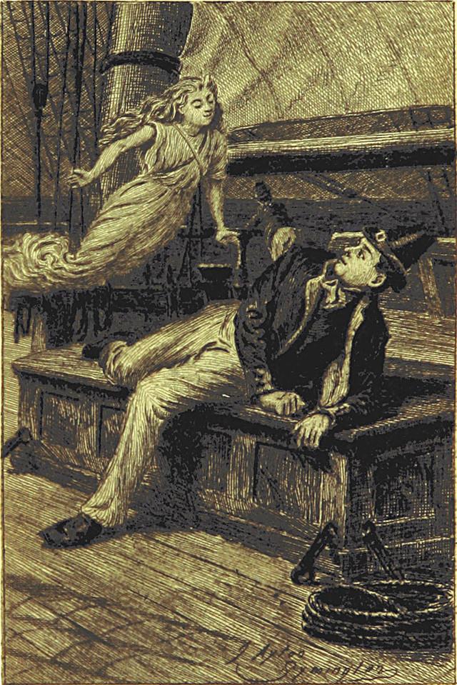 Swirling mist is a precursor to the Hollywood cliché of the camera circling two people kissing. From Mr. Midshipman Easy by Frederick Marryat, 1896.